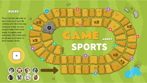 Touch the dice and jump as many steps as it says. Be carefull with the stars and the black stone you can go back some steps or be asked to answer some questions. The stones with an x2 and an x3 helps to move foward faster