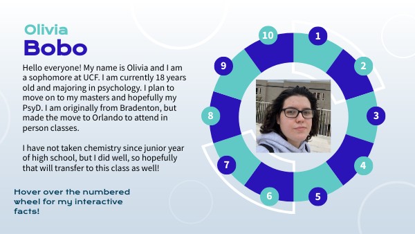 Hello everyone! My name is Olivia and I am a sophomore at UCF. I am currently 18 years old and majoring in psychology. I plan to move on to my masters and hopefully my PsyD. I am originally from Bradenton, but made the move to Orlando to attend in person classes. I have not taken chemistry since junior year of high school, but I did well, so hopefully that will transfer to this class as well!
