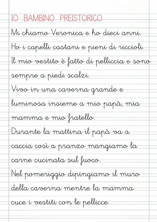 IO BAMBINO PREISTORICO Mi chiamo Veronica e ho dieci anni. Ho i capelli castani e pieni di riccioli. Il mio vestito è fatto di pelliccia e sono sempre a piedi scalzi. Vivo in una caverna grande e luminosa insieme a mio papà, mia mamma e mio fratello. Durante la mattina il papà va a caccia così a pranzo mangiamo la carne cucinata sul fuoco. Nel pomeriggio dipingiamo il muro della caverna mentre la mamma cuce i vestiti con le pellicce.