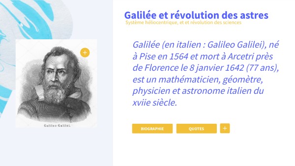 Galilée (en italien : Galileo Galilei), né à Pise en 1564 et mort à Arcetri près de Florence le 8 janvier 1642 (77 ans), est un mathématicien, géomètre, physicien et astronome italien du xviie siècle.