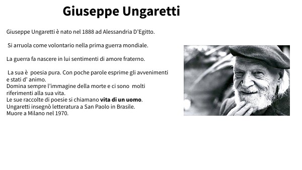 Giuseppe Ungaretti è nato nel 1888 ad Alessandria D’Egitto. Si arruola come volontario nella prima guerra mondiale. La guerra fa nascere in lui sentimenti di amore fraterno. La sua è poesia pura. Con poche parole esprime gli avvenimenti e stati d’ animo. Domina sempre l’immagine della morte e ci sono molti riferimenti alla sua vita. Le sue raccolte di poesie si chiamano vita di un uomo. Ungaretti insegnò letteratura a San Paolo in Brasile. Muore a Milano nel 1970.
