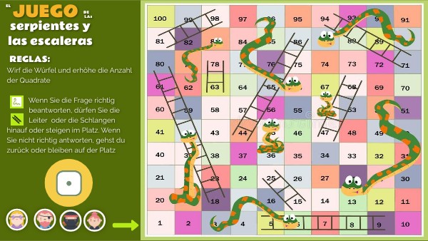 Wirf die Würfel und erhöhe die Anzahl der Quadrate Wenn Sie die Frage richtig beantworten, dürfen Sie die Leiter oder die Schlangen hinauf oder steigen im Platz. Wenn Sie nicht richtig antworten, gehst du zurück oder bleiben auf der Platz