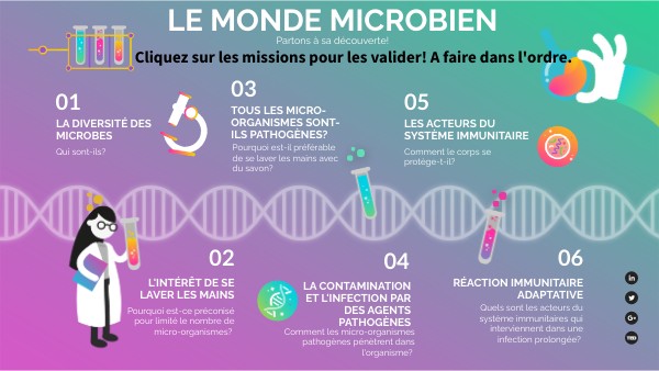 Bravo!! Pour consolider la découverte de cette partie du système immunitaire adaptatif, je te propose un jeu sérieux, dans lequel tu dois combattre une infection à l'aide du système immunitaire mis en place et en suivant les consignes. Remarque: lis bien ce qui est dit pour t'aider à combattre l'infection!