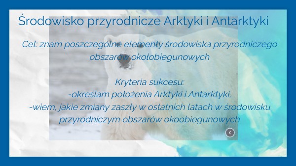 Cel: znam poszczególne elementy środowiska przyrodniczego obszarów okołobiegunowych Kryteria sukcesu: -określam położenia Arktyki i Antarktyki, -wiem, jakie zmiany zaszły w ostatnich latach w środowisku przyrodniczym obszarów okoobiegunowych