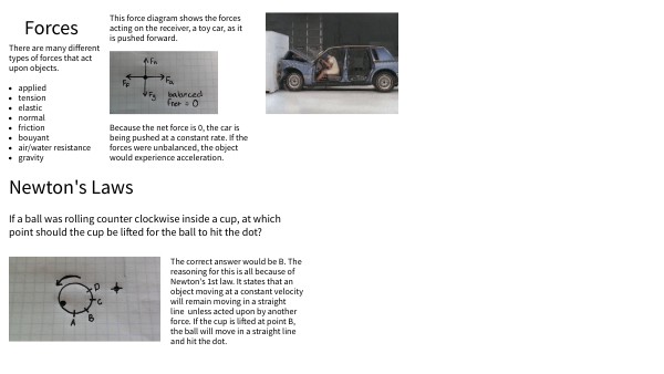 First Law Newton's first law states that an object at rest or moving in a constant velocity will continue to be in that state of motion unless acted upon by an unbalanced force. This connects to a car crash because when the car hit something, the human still wants to move forward, causing the person to get pushed out of their seat. Second Law Newton's second law describes the relationship betwen force, mass, and acceleration. It states that Force=mass x aceleration. This can relate to the car crash challenge. We calculated the mass of our cars and the speed. If we calculated acceleration, we would be able to figure out the amoount of force acting on the car. Third Law Newton's third law mentions paired forces and how every action has an equal and opposite reaction. In the car crash challege, the paired forces could be the Fn from the track and the Fa from the car.