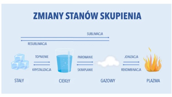 Wiemy, że zmieniając temperaturę substancji, można doprowadzić do zmiany jej stanu skupienia (lód, woda, para wodna). Na co dzień obserwujemy wiele zjawisk związanych ze zmianami stanów skupienia (parowanie, skraplanie, krzepnięcie, itd.). Podsumujmy je za pomocą schematu.