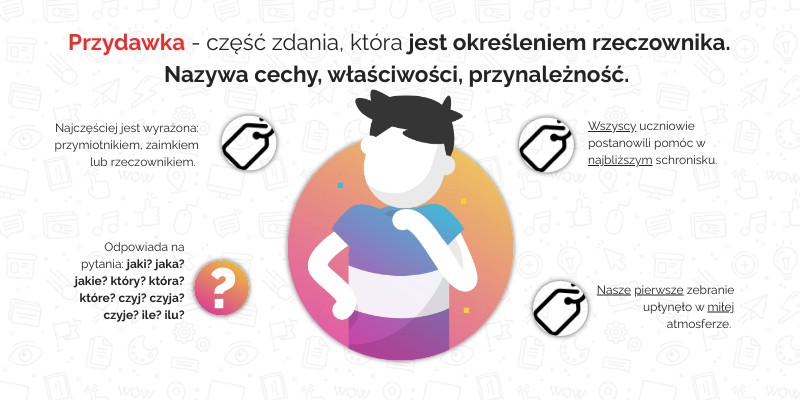 Przydawka - część zdania, która jest określeniem rzeczownika. Nazywa cechy, właściwości, przynależność.
