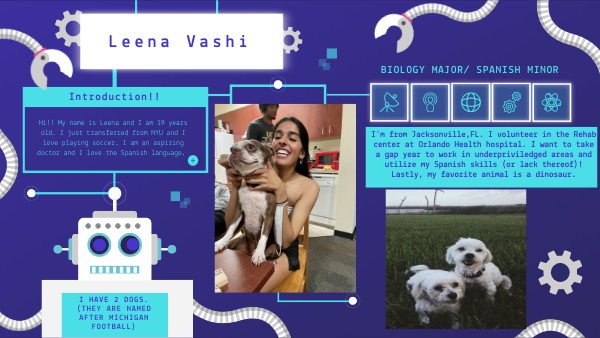 Hi!! My name is Leena and I am 19 years old. I just transferred from NYU and I love playing soccer. I am an aspiring doctor and I love the Spanish language.
