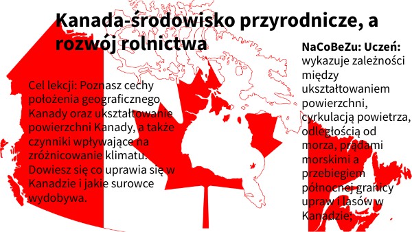 Cel lekcji: Poznasz cechy położenia geograficznego Kanady oraz ukształtowanie powierzchni Kanady, a także czynniki wpływające na zróżnicowanie klimatu. Dowiesz się co uprawia się w Kanadzie i jakie surowce wydobywa.