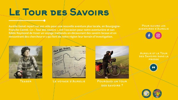 Aurélie Gonet va partir à vélo sur les routes de Bourgogne - Franche - Comté. Durant deux semaines elle va rencontrer des gens, recueillir et mettre en lumière leurs savoirs. Elle postera les histoires de ses rencontres, en live, sur Facebook et Instagram. Réalisation de la vidéo : Sébastien Berna/VDS prodScénario: Thibault Roy