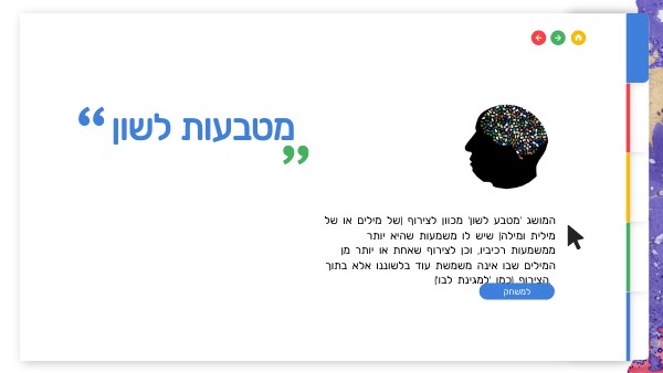 הטילו קוביה והתקדמו במסלול. המסלול מכיל מטבעות לשון בשפה העברית. לחצו עם העכבר על הכוכב והסבירו את מטבע הלשון. בלחיצה ניתן לראות את התשובה הנכונה. כל תשובה נכונה מזכה ב-5 נקודות. השחקן שמגיע ראשון לסוף המסלול מקבל 10 נקודות. כל טעות תאלץ את השחקן לקחת צעד אחורה. בנוסף, יש בוסטרים לניקוד. במידה ושחקן עומד על *2 או *3- מספר הנקודות מוכפל לפי הכתוב