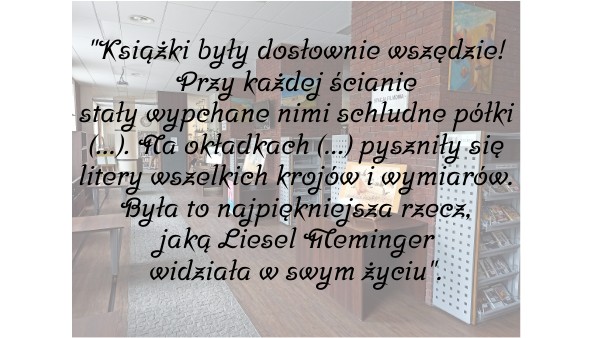 "Książki były dosłownie wszędzie! Przy każdej ścianie stały wypchane nimi schludne półki (...). Na okładkach (...) pyszniły się litery wszelkich krojów i wymiarów. Była to najpiękniejsza rzecz, jaką Liesel Meminger widziała w swym życiu".