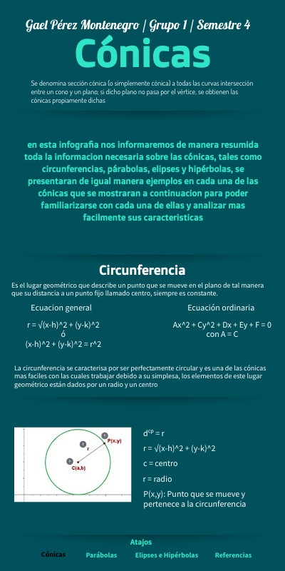 en esta infografia nos informaremos de manera resumida toda la informacion necesaria sobre las cónicas, tales como circunferencias, párabolas, elipses y hipérbolas, se presentaran de igual manera ejemplos en cada una de las cónicas que se mostraran a continuacion para poder familiarizarse con cada una de ellas y analizar mas facilmente sus caracteristicas
