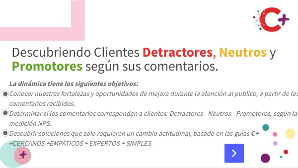 La dinámica tiene los siguientes objetivos:Conocer nuestras fortalezas y oportunidades de mejora durante la atención al publico, a partir de los comentarios recibidos.Determinar si los comentarios corresponden a clientes: Detractores - Neutros - Promotores, según la medición NPS. Descubrir nuevas maneras de ofrecer soluciones a nuestros clientes, a partir de un cambio actitudinal, basado en las Guías de Experiencia: C+CERCANO C+EMPÁTICO C+ EXPERTO C+ SIMPLE