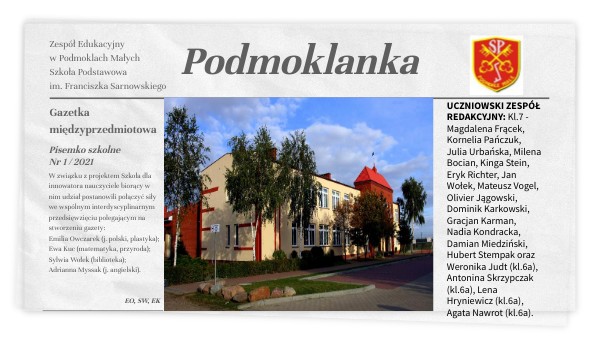 W związku z projektem Szkoła dla innowatora nauczyciele biorący w nim udział postanowili połączyć siły we wspólnym interdyscyplinarnym przedsięwzięciu polegającym na stworzeniu gazety:Emilia Owczarek (j. polski, plastyka); Ewa Kuc (matematyka, przyroda); Sylwia Wołek (biblioteka); Adrianna Myssak (j. angielski).
