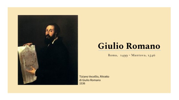 Giulio Romano, chiamato Giulio Pippi de' Jannuzzi, o Giannuzzi nasce a Roma intorno al 1499. Da giovanissimo entra nella bottega romana di Raffaello Sanzio, di cui diverrà il miglior allievo e con cui collaborò nelle grandi imprese pittoriche come gli affreschi della villa Farnesina, delle Logge e delle Stanze Vaticane. Tra i suoi viaggi di lavoro e culturali visitò Pozzuoli, Napoli e Campagna, Milano e Torreglia. I suoi primi progetti di architettura furono a Roma: il palazzo Adimari Salviati, la Villa Lante sul Gianicolo e il Palazzo Maccarani Stati. Nel 1524 fu invitato, come artista di corte, a Mantova da Federico II Gonzaga per occuparsi del cantiere della villa di Marmirolo e della scuderia che si trovava in una località chiamata Te. Giulio Romano realizzò inoltre un grandioso edificio, conosciuto come Palazzo Te utilizzando l'aiuto di Raffaellino del Colle. Si sposò nel 1529 con la nobile Elena Guazzo con cui ebbe un figlio. La morte avvenuta nel 1546 gli impedì di diventare il primo architetto della fabbrica di San Pietro.