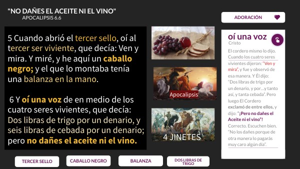 5 Cuando abrió el tercer sello, oí al tercer ser viviente, que decía: Ven y mira. Y miré, y he aquí un caballo negro; y el que lo montaba tenía una balanza en la mano. 6 Y oí una voz de en medio de los cuatro seres vivientes, que decía: Dos libras de trigo por un denario, y seis libras de cebada por un denario; pero no dañes el aceite ni el vino.