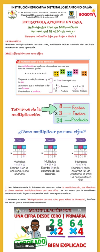 1. Lee detenidamente la información anterior sobre la multiplicación, sus términos y cómo resolver multiplicaciones por una cifra. Lee las veces que lo consideres necesario hasta lograr comprender cada concepto abordado. 2. Observa el video “Multiplicación por una cifra para niños de Primaria”, Repítelo las veces que lo consideres necesario.