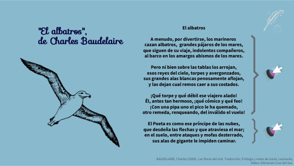 El Poeta es como ese príncipe de las nubes, que desdeña las flechas y que atraviesa el mar; en el suelo, entre ataques y mofas desterrado, sus alas de gigante le impiden caminar.