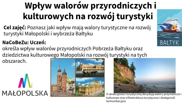 NaCoBeZu: Uczeń: określa wpływ walorów przyrodniczych Pobrzeża Bałtyku oraz dziedzictwa kulturowego Małopolski na rozwój turystyki na tych obszarach.