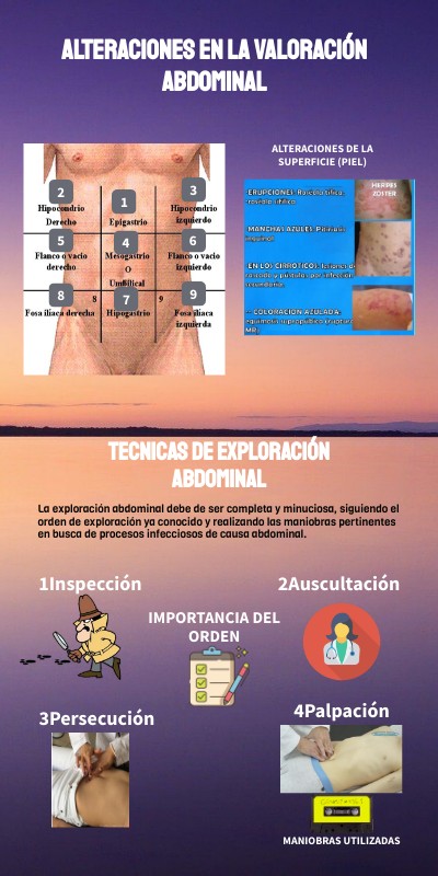 La exploración abdominal debe de ser completa y minuciosa, siguiendo el orden de exploración ya conocido y realizando las maniobras pertinentes en busca de procesos infecciosos de causa abdominal.