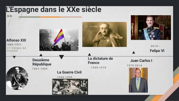 Le 17 et 18 juillet 1936 Franco et Mola commencent le coup d'État. Ils utilisent les forces armées pour envahir quelques villes importantes. Accord de non intervention: les autres pays ne peuvent pas aider aucun de deux côtés.Le 1er avril 1939 Franco déclare sa victoire à la radio. La période après la guerre (posguerra) laisse beaucoup de faim, de pauvreté et de pénurie
