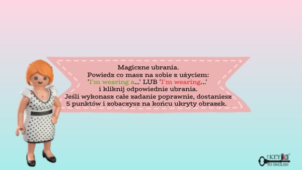 Magiczne ubrania. Powiedz co masz na sobie z użyciem: 'I'm wearing a...' LUB 'I'm wearing...' i kliknij odpowiednie ubrania. Jeśli wykonasz całe zadanie poprawnie, dostaniesz 5 punktów i zobaczysz na końcu ukryty obrazek.