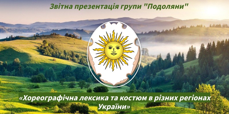 Ми група "Подоляни". Ми досліджуєм питання "Основні рухи та костюми притаманні регіону України «Поділля»". Нам дуже цікаво, чим ж відрізняється культура Поділля від інших регіонів України.