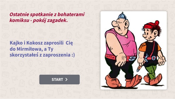 BRAWO!!! Udało Ci się odnaleźć Kajka. Bohater długo nie wracał, bo jego towarzysz, Kokosz poczuł zapach skrzydełek w miodzie i postanowił je zjeść, bo od dawna nic nie jadł, ale niestety zgubił się w lesie. Pomóż mu odnaleźć towarzysza. Aby to zrobić, kliknj postać obok i rozwiąż kolejne zagadki.