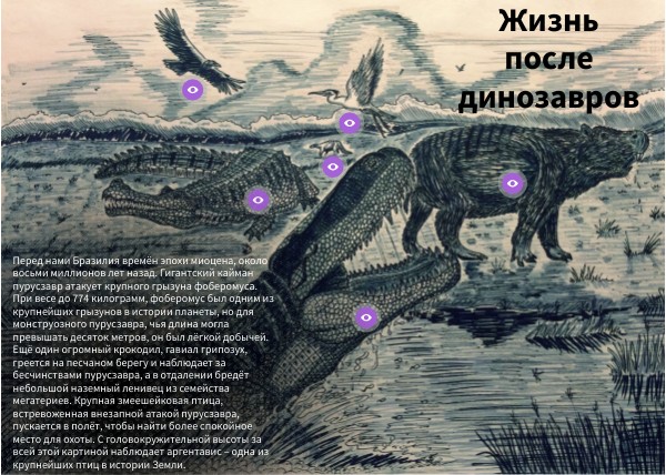 Перед нами Бразилия времён эпохи миоцена, около восьми миллионов лет назад. Гигантский кайман пурусзавр атакует крупного грызуна фоберомуса. При весе до 774 килограмм, фоберомус был одним из крупнейших грызунов в истории планеты, но для монструозного пурусзавра, чья длина могла превышать десяток метров, он был лёгкой добычей. Ещё один огромный крокодил, гавиал грипозух, греется на песчаном берегу и наблюдает за бесчинствами пурусзавра, а в отдалении бредёт небольшой наземный ленивец из семейства мегатериев. Крупная змеешейковая птица, встревоженная внезапной атакой пурусзавра, пускается в полёт, чтобы найти более спокойное место для охоты. С головокружительной высоты за всей этой картиной наблюдает аргентавис – одна из крупнейших птиц в истории Земли.