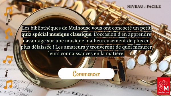 Les bibliothèques de Mulhouse vous ont concocté un petit quiz spécial musique classique. L'occasion d'en apprendre davantage sur une musique malheureusement de plus en plus délaissée ! Les amateurs y trouveront de quoi mesurer leurs connaissances en la matière.