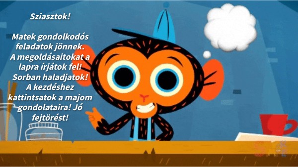 Sziasztok! Matek gondolkodós feladatok jönnek. A megoldásaitokat a lapra írjátok fel! Sorban haladjatok! A kezdéshez kattintsatok a majom gondolataira! Jó fejtörést!