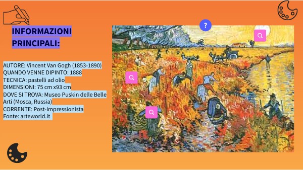 AUTORE: Vincent Van Gogh (1853-1890)QUANDO VENNE DIPINTO: 1888 TECNICA: pastelli ad olio DIMENSIONI: 75 cm x93 cmDOVE SI TROVA: Museo Puskin delle Belle Arti (Mosca, Russia) CORRENTE: Post-Impressionista Fonte: arteworld.it