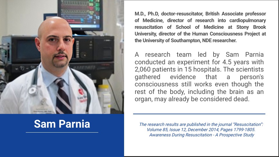 M.D., Ph.D, doctor-resuscitator, British Associate professor of Medicine, director of research into cardiopulmonary resuscitation of School of Medicine at Stony Brook University, director of the Human Consciousness Project at the University of Southampton, NDE researcher.