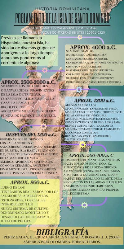 Es una infografía sobre el poblamiento de la isla de Santo Domingo, en ella deben aparecer los orígenes, las rutas, los medios de transporte, características y aportes materiales de los primeros pobladores.