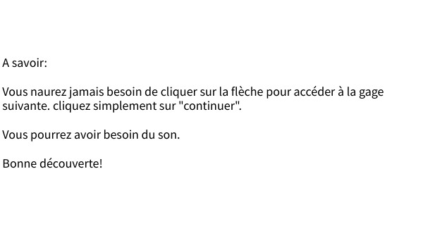 A savoir: Vous naurez jamais besoin de cliquer sur la flèche pour accéder à la gage suivante. cliquez simplement sur "continuer". Vous pourrez avoir besoin du son. Bonne découverte!