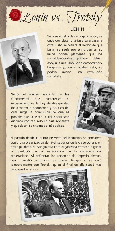 Trotsky sostiene la teoría de la revolución permanente donde establece que una revolución dentro de las fronteras nacionales no se llevaría a cabo exitosamente y resultaría inutil ya que no ganarían. Una vez más, Trotsky le lleva la contraria a Lenin, y una vez más resulta ser menos exitoso que Lenin. Trotsky únicamente representaba sus propios intereses, además de que saltaba de ideología a ideología ya que no estaba de acuerdo con ninguno pero al pertenecer a todos, podría decir que estaba por encima de los demás.