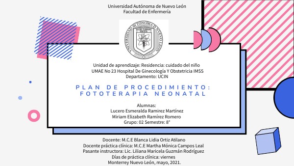 El presente proyecto de mejora se llevará a cabo de manera hipotética debido a la situación actual por COVID 19. Lo primero que se realizó, fue establecer problemáticas respecto a los procedimientos que se realizan con las patologías más frecuentes de nuestra clínica (UMAE no. 23) entre los cuales se encuentra la ictericia neonatal, para la cual se realiza el procedimiento de fototerapia. Estando en la práctica anteriormente notamos distintos factores que tenían áreas de oportunidad, por lo cual, creamos este plan. Para seguir, establecimos la metodología del proyecto, así como la manera en la que se iba a aplicar. Se establecerá un plan de enfermería para tratar la problemática acordada, estableciendo objetivos y realizando intervenciones.