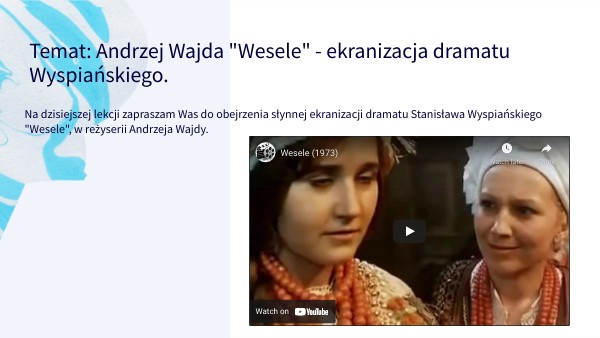 Na dzisiejszej lekcji zapraszam Was do obejrzenia słynnej ekranizacji dramatu Stanisława Wyspiańskiego "Wesele", w reżyserii Andrzeja Wajdy.
