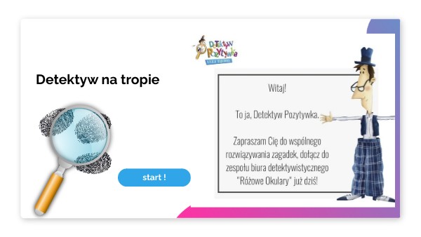 Detektyw Pozytywka prowadzi agencję detektywistyczną Różowe Okulary, która mieści się na poddaszu kamienicy. Mieszkańcy tego budynku często zgłaszają się do niego z nietypowymi zleceniami. Pomóż detektywowi walczyć ze złoczyńcami. Rozwiązuj zagadki , szukaj wskazówek.Pomocna okaże się książka "Detektyw Pozytywka" Grzegorza Kasdepke.