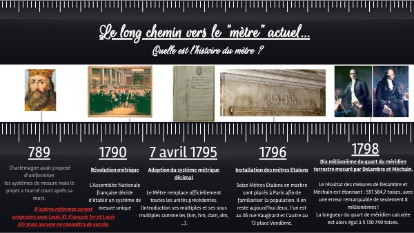 Adoption du système métrique décimalLe Mètre remplace officiellement toutes les unités précédentes.(Introduction ses multiples et ses sous multiples comme les (km, hm, dam, dm, …).