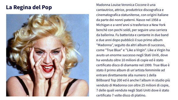 Madonna Louise Veronica Ciccone è una cantautrice, attrice, produttrice discografica e cinematografica statunitense, con origini italiane da parte dei nonni paterni. Nasce nel 1958 a Michigan e a vent'anni si trasferisce a New York benchè con pochi soldi, per seguire una carriera da ballerina. Fu batterista e cantante in due band e due anni dopo pubblicò il suo primo album "Madonna", seguito da altri album di successo, come "True Blue" e "Like a Virgin". Like a Virgin ha avuto un enorme successo negli Stati Uniti, dove ha venduto oltre 10 milioni di copie ed è stato certificato disco di diamante nel 1999. True Blue è stato il primo album di un'artista femminile ad entrare direttamente alla numero 1 della Billboard Top 200 ed è anche l'album in studio più venduto di Madonna con oltre 25 milioni di copie, 7 delle quali vendute negli Stati Uniti dove è stato certificato 7 volte disco di platino.