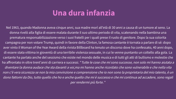 Nel 1963, quando Madonna aveva cinque anni, sua madre morì all'età di 30 anni a causa di un tumore al seno. La donna rivelò alla figlia di essere malata durante il suo ultimo periodo di vita, scatenando nella bambina una prematura responsabilizzazione verso i suoi fratelli per i quali prese il ruolo di genitore. Dopo la sua colorita campagna per non votare Trump, quindi in favore della Clinton, la famosa cantante è tornata a parlare di sé: dopo aver vinto il Woman of the Year Award della rivista Billboard ha tenuto un discorso dove ha confessato, 40 anni dopo, di essere stata vittima in gioventù di una terribile violenza sessuale, in cui le venne puntanto un coltello alla gola. La cantante ha parlato anche del sessismo che esiste nel mondo delle musica e di tutti gli atti di bullismo e molestie che ha affrontato in oltre trent'anni di carriera e successi. "Tutte le cose che mi sono successe, non solo mi hanno aiutata a diventare la donna audace che sta davanti a voi,ma mi hanno anche ricordato che sono vulnerabile e che nella vita non c'è vera sicurezza se non la mia convinzione e comprensione che io non sono la proprietaria del mio talento, è un dono fattomi da Dio, tutto quello che ho e anche quello che mi è successo e che mi continua ad accadere, sono regali per rendermi più forte. "