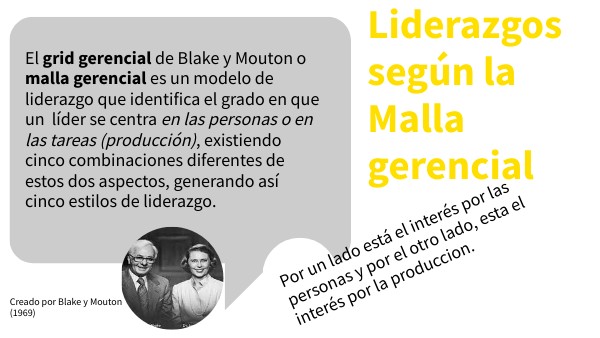 El grid gerencial de Blake y Mouton o malla gerencial es un modelo de liderazgo que identifica el grado en que un líder se centra en las personas o en las tareas (producción), existiendo cinco combinaciones diferentes de estos dos aspectos, generando así cinco estilos de liderazgo.