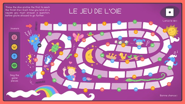 Throw the dice and be the first to reach the finish line ! Each time you land on a square you must answer a question. before you're allowed to go further.