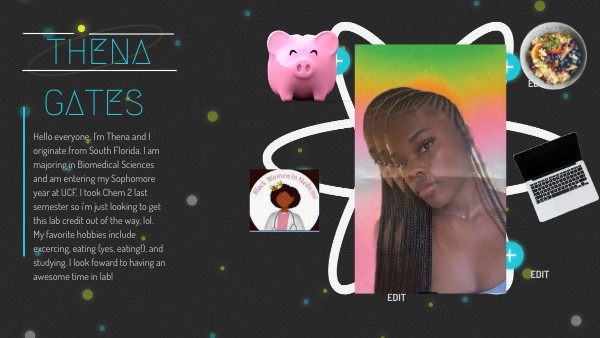 Hello everyone, I'm Thena and I originate from South Florida. I am majoring in Biomedical Sciences and am entering my Sophomore year at UCF. I took Chem 2 last semester so i'm just looking to get this lab credit out of the way, lol.My favorite hobbies include excercing, eating (yes, eating!), and studying. I look foward to having an awesome time in lab!