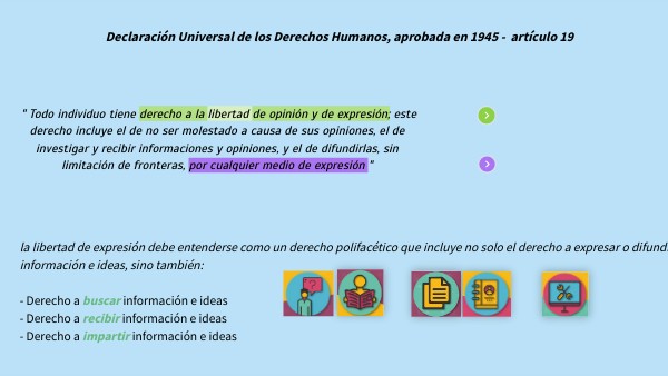 " Todo individuo tiene derecho a la libertad de opinión y de expresión; este derecho incluye el de no ser molestado a causa de sus opiniones, el de investigar y recibir informaciones y opiniones, y el de difundirlas, sin limitación de fronteras, por cualquier medio de expresión "
