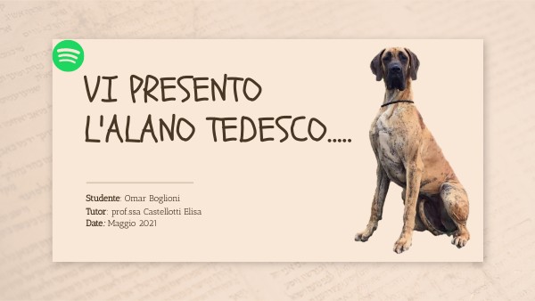 L’alano è un cane alto, elegante, molto docile e adatto alle famiglie. L’alano ha il pelo raso, lucido e può essere dei seguenti colori:-blu -tigrato -fulvo -arlecchino -nero Nonostante la sua mole è un cane molto delicato, che ha bisogno di molte cure e attenzioni.