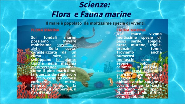 FAUNA MARINA Nel mare vivono moltissime specie di pesci sarde, spigole, orate, murene, triglie, branzini e tonni. Troviamo anche numerosi molluschi come le seppie i polpi e i calamari, le vongole,le cozze e crostacei, come granchi, gemberi e aragoste. Sui fondali abitano anche spugne e coralli. Lungo la costa nidificano varie specie di uccelli: i più diffusi sono i gabbiani.