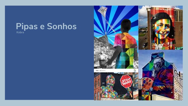 La obra que elegí presentar se llama "Pipas e Sonhos". Por cierto, esta obra es uno de los carteles creados para promotionar los Juegos Olímpicos de Río de Janeiro de 2016. En este cartel, podemos ver a un chico de las favelas que mira hacia el mundialmente famoso "Corcovado" de Río de Janeiro y delante del cual hay una cometa con el logo de los Juegos Olímpicos. Además del buen dibujo, los colores son muy importantes así : las favelas son en blanco y negro para representar la miseria y la pobreza mientras que el chico , la cometa y el cielo que representan esperanza para el futuro, ellos, son coloridos. Si se mira bien, se puede observar que este cartel es lleno de metáforas, por ejemplo, la cometa de los Juegos Olímpicos que explica que podren permitir de volar...